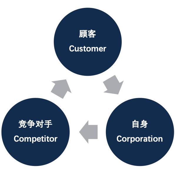 只有将公司、顾客与竞争者整合在同一个战略内,可持续的竞争优势才有存在的可能。 大前研一将这三个关键因素称作为3C或战略三角。
