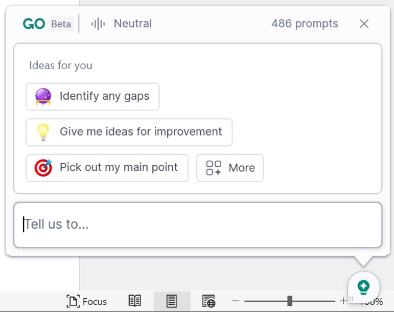 虽然我并不认为它很棒,但是一个体现了这些想法的当前设计是 Grammarly 写作助手的 AI 功能(如下所示)。除了明确他们的需求外,用户还可以点击几个常见需求的按钮。